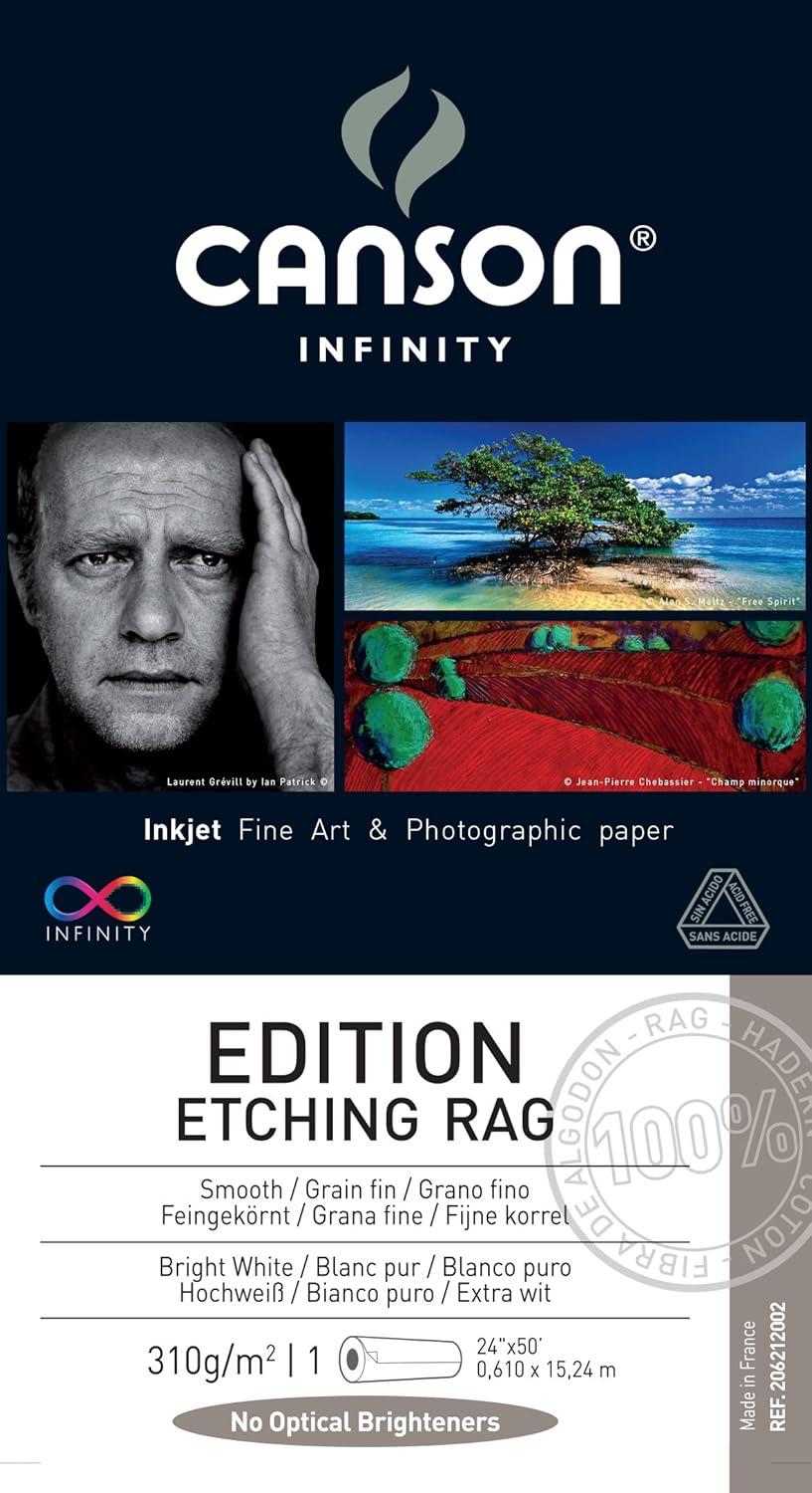 Size: 24 x 50 foot roll, Style Name: Roll. Canson infinity Edition Etching Rag is a 100 percent cotton rag, bright white printmaking paper with a smooth texture. Edition Etching is internally buffered, acid free, and museum grade. This is for one 24 x 50 foot roll of 310 gram paper that contains no OBAs (optical brightening agents). All Canson Infinity ICC profiles are available on Canson-Infinity website.
